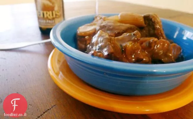 מוסיף את הבירה תוך ערבוב. להחזיר את הבשר לסיר, ולהוסיף את צרור עשבי תיבול, 1 כפית מלח, ו גרימת פלפל, ערבוב הכל ביחד. הבשר צריך להיות שקוע כמעט לחלוטין; אם לא, להוסיף עוד בירה (או מים, מרק או מלאי). מבשלים בבועה נמוכה מאוד, הצבת מפזר חום מתחת לסיר במידת הצורך והגדרת המכסה פתוחה פחות או יותר כדי לעזור לשלוט בטמפרטורה. מבשלים את הבשר עד שיפוד מחליק בקלות פנימה, במיוחד, החוצה-על 3 שעות.