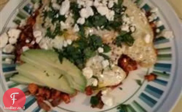 מניחים את הביצים המבושלות על תערובת תפוחי האדמה. למעלה עם כוסברה, גבינת פטה, ואבוקדו לשרת.