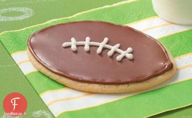 מורחים זיגוג חום על עוגיות. צינור זיגוג לבן על עוגיות ליצירת שרוכי כדורגל.