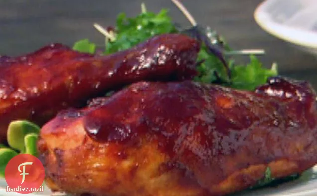 מסדרים את העוף המצופה במחבת צלייה או על הגריל. קוק (מכוסה, אם צלייה) במשך 40 עד 45 דקות או עד מבושל דרך, צולה עם רוטב 1/3 כוס שמור לאחר 20 דקות.