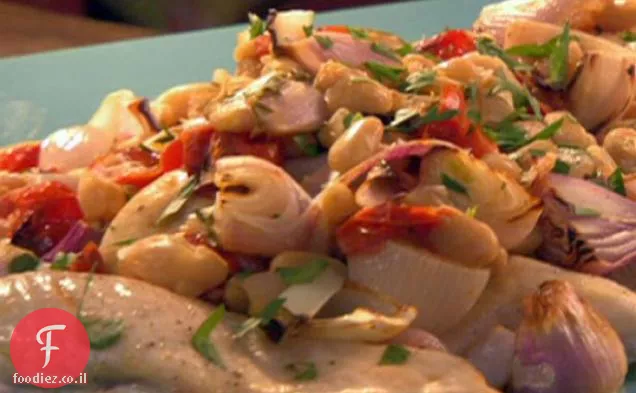 עוף עם שאלוט קלוי, עגבניות ושעועית לבנה