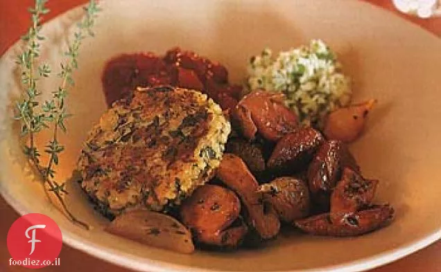 תערובת פטריות צלויות, מכוסה בנייר כסף, בשליש העליון של בתנור ובצל פנינה, חשופות, בשליש התחתון, בוחשות מדי פעם ומחליפות מיקום של מחבתות באמצע הקלייה, עד שבצל פנינה רך וחום זהוב, כ -45 דקות בסך הכל.