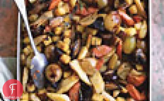 מניחים פטריות ושום על תבנית אפייה אחרת מעוטרת; טפטוף עם שאריות שמן 1/3 כוס, מפזרים מלח ופלפל, וזורקים למעיל. ירקות שורש צלוי עד רך וחום בקצוות, ערבוב כל 15 דקות, על 1 שעה. פטריות צלויות ושום עד רך, ערבוב פעם אחת, על 30 דקות.