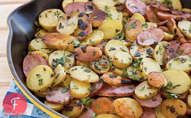ממיסים חמאה בשמן זית במחבת גדולה ולא דביקה על חום בינוני-גבוה. מערבבים בתפוחי אדמה, 1/4 כפית מלח, והבא 3 מרכיבים. מכסים ומבשלים, ערבוב מדי פעם, 8 דקות או עד תפוחי אדמה ובצלצלים מתחילים חום.