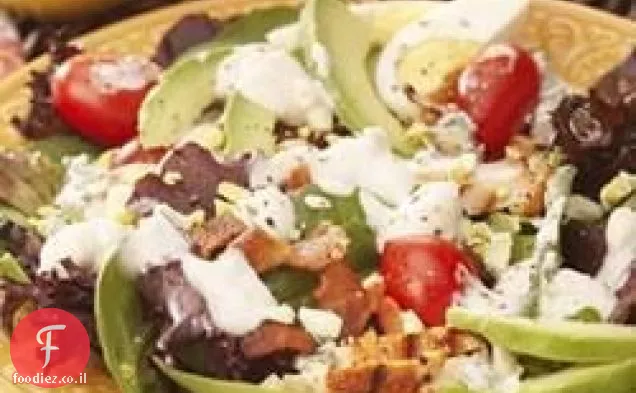 מערבבים תערובת סלט, עגבניות מן שקיק, עוף פרוס מבושל, אבוקדו, בייקון, ביצה וגבינה כחולה בקערה גדולה. זורקים עם רוטב גבינה כחולה, לפי הטעם.
